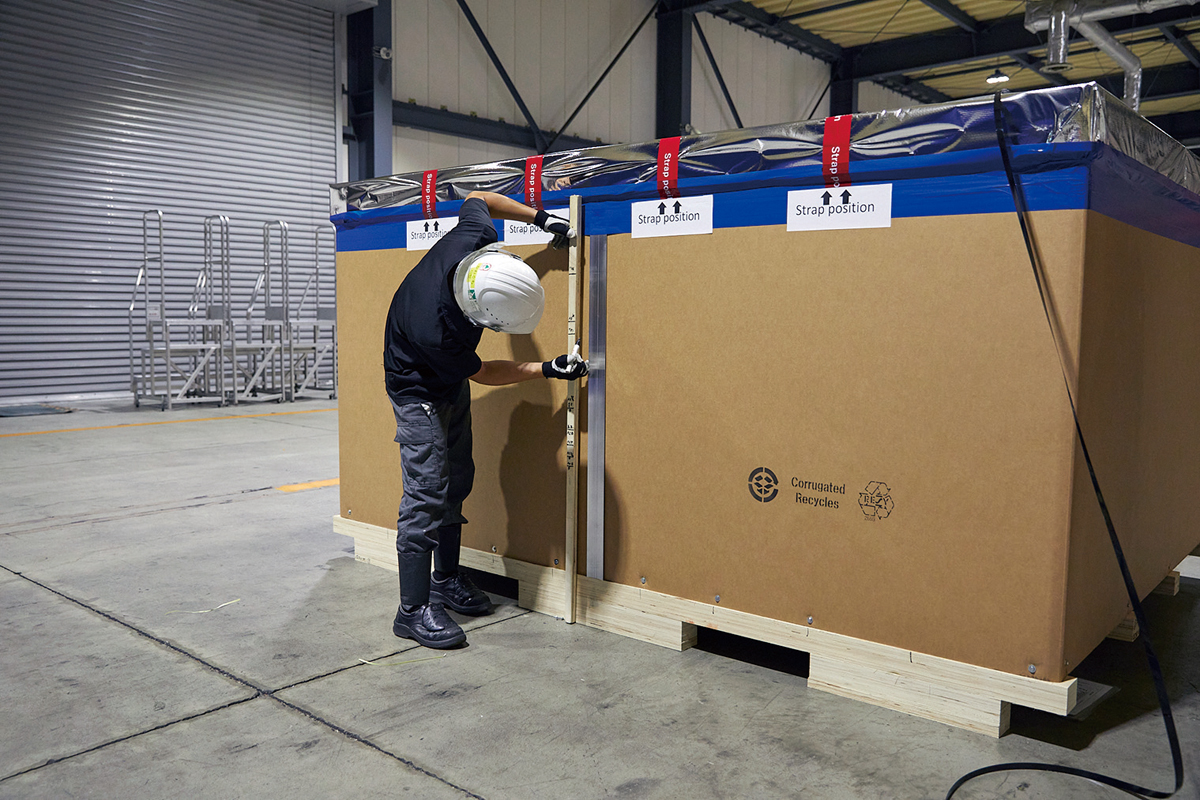 弊社では木材梱包に代わる強化段ボール梱包への技術を進め、出荷先で開梱後の木材廃棄に伴うCO2削減を実現しました。同時に廃材のバイオ燃料へのリサイクルも推進しています。