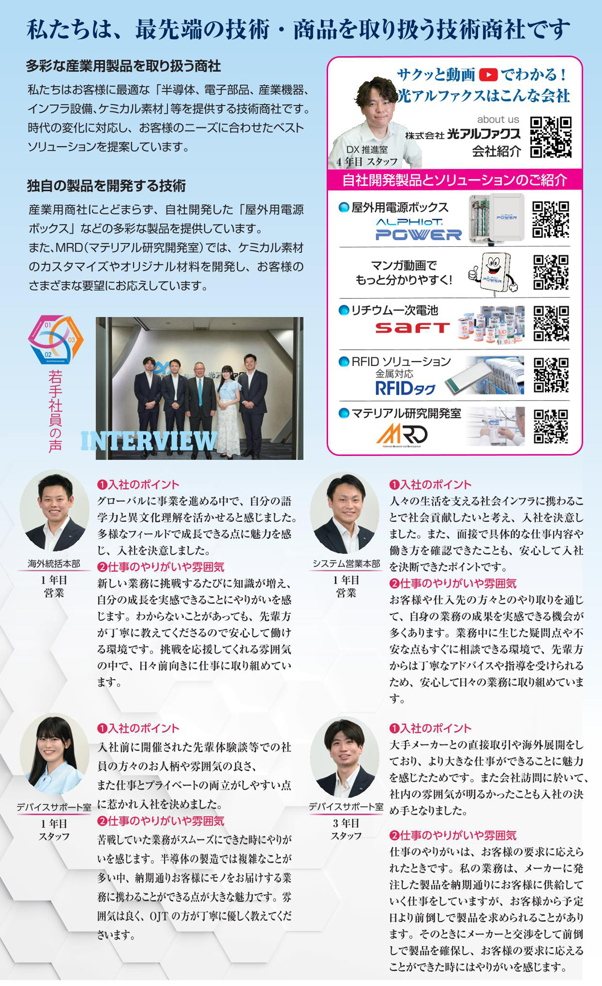 当社の一番の特長は、売買取引だけではなく、得意先や仕入先とともに、新規商材や技術の開発に貢献していることです。上記の商材や技術は情報通信やモビリティ、食品、環境エネルギー、ライ …
