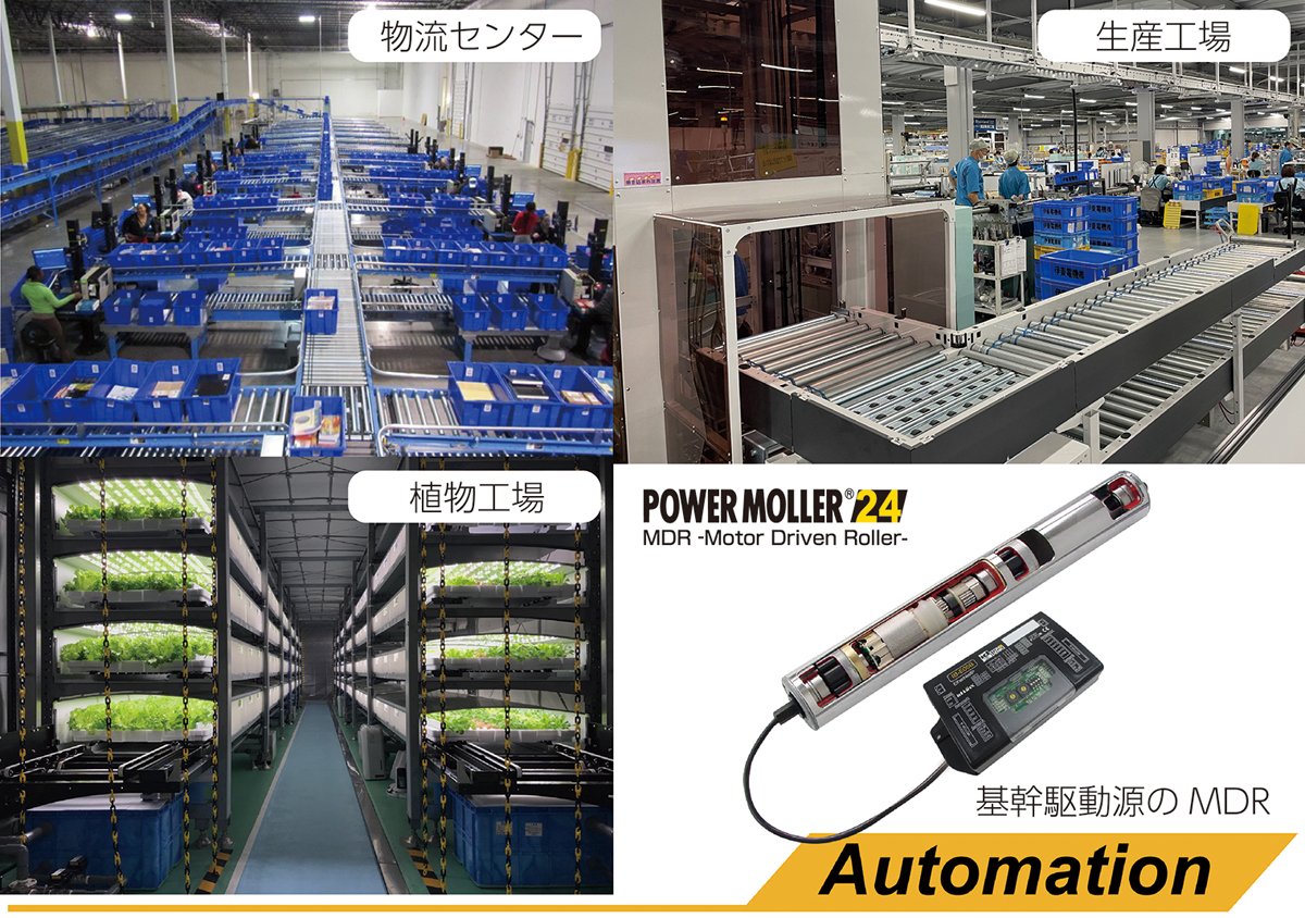 弊社は、工場や物流センターで物品を運ぶローラコンベヤに欠かせないパーツ(MDR:Motor Driven Roller 商品名パワーモーラ)のトップメーカーです。世界シェア50%を有しています。モーターと制御技術をコアにオリジナルコンセプトのコンベヤシステムを開発し、生産・物流業界に貢献しています。社会のインフラを支えています。常に10年先を見据えたモノづくりを行う先行開発型の企業です。