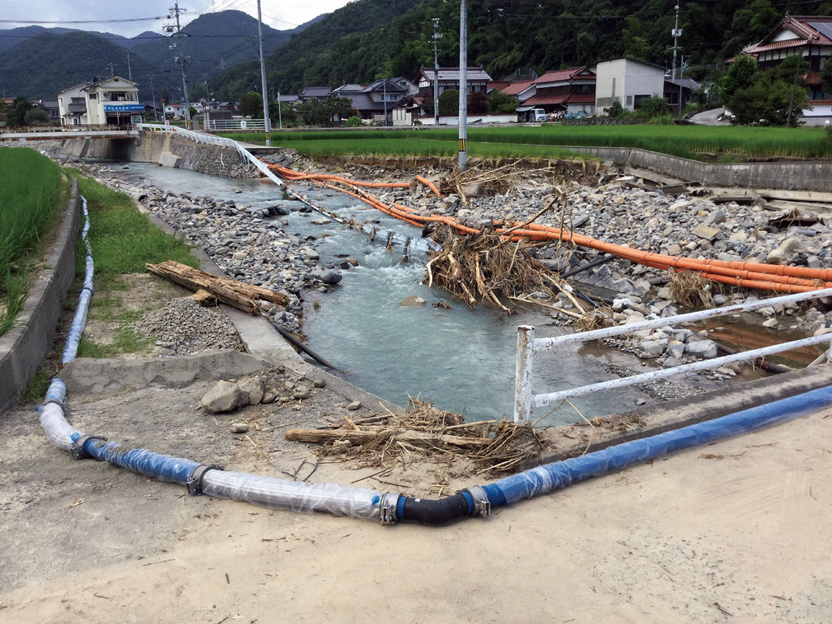 これまで仮設配管には、耐久性が低く使用後は産業廃棄物として処分せざるをえない塩化ビニル管が使用されていました。大量の廃棄物を前に「どうにかできないものか」と考えた当社は、水道本管にも使用されるポリエチレン素材に着目。洗浄・殺菌して繰り返し使える仮設配管「リユーズシステム」を開発しました。「リユーズシステム」は従来の管に比べて施工が簡単で、再利用が可能なため処分費用も発生しません。環境負荷の低減が評価され、2021(令和3)年には、「おおさか気候変動対策賞」優秀賞を受賞。全国の水道管更新工事や、集合住宅の配管更新工事などで利用が進んでいます。この「リユーズシステム」は災害時の漏水・断水の復旧にも活用可能です。現在、大阪市や奈良市など全国約50の自治体と災害協定を締結しており、災害発生時のライフラインの復旧要請に応えています。
