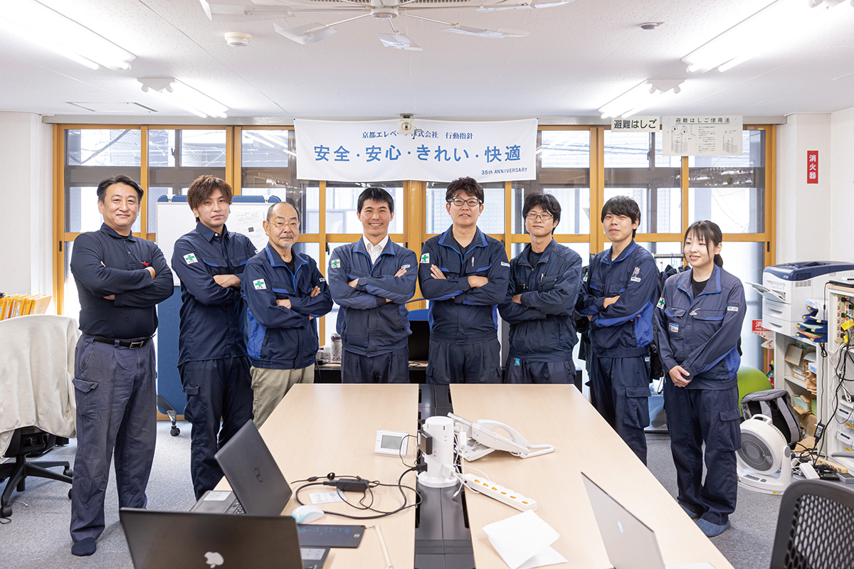 当社は1983(昭和58)年に創業し、京都・滋賀をはじめとする関西エリアで、エレベータのメンテナンスや製造を行う会社です。エレベータメンテナンスの業界は、その多くが三菱電機・日立製作所・東芝・日本オーチス・フジテックの5大メーカーに属していますが、当社はそうしたメーカーに属さない「独立系」企業で、どのメーカーでも対応できる柔軟さと、緊急時にすぐに駆け付けられる迅速さが強みです。その中でも、当社はメンテナンスだけでなく、製造メーカーとしての機能も備えている点が大きな特徴と言えます。元々は当社も保守・点検からのスタートでしたが、多種多様な機種のメンテナンスで培ってきた知識と経験、そしてお客さまのご要望に応えたいという想いから、事業の幅を拡大していきました。現在では設計・製造・販売・据付・保守まで自社で一貫して行える体制を整えており、低コストかつ高品質なサービスを実現。大手企業や官公庁からも数多くご契約いただいており、関西の独立系企業としてはトップレベルの業績を誇る会社へと成長しました。