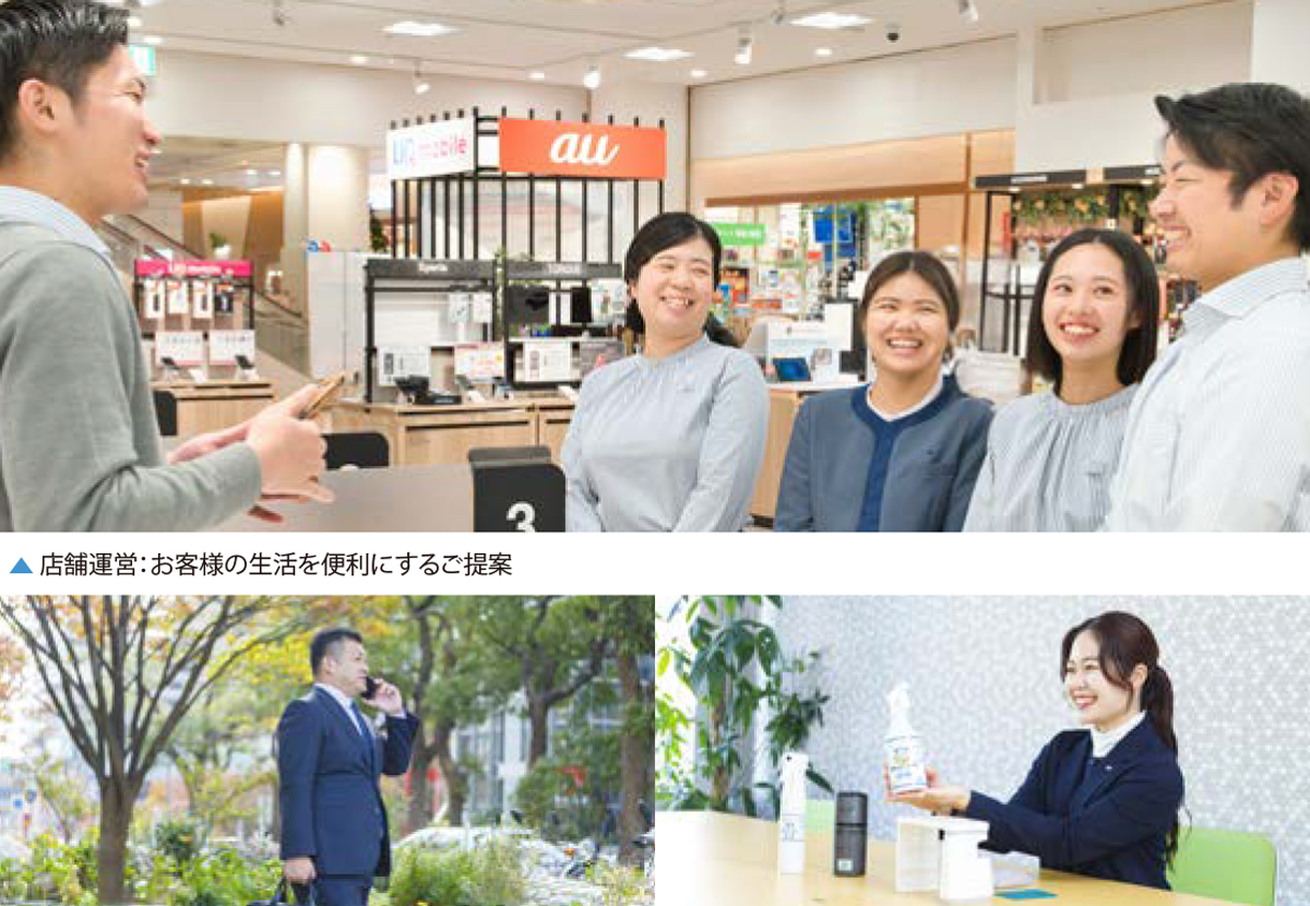 店舗運営、コミュニケーションサポート、クリーンリフレの3つの事業を通じて、日々の暮らしを「豊か」にする価値を提供しています。時代の変化とお客さまの多様なニーズに対応するため、「もっと喜んでいただく方法はないか」を常に考え、挑戦し続けています。「人の成長なくして企業の成長なし」という考えのもと、通信分野のさらなる拡大や新たなビジネスモデルの確立に挑み続けます。