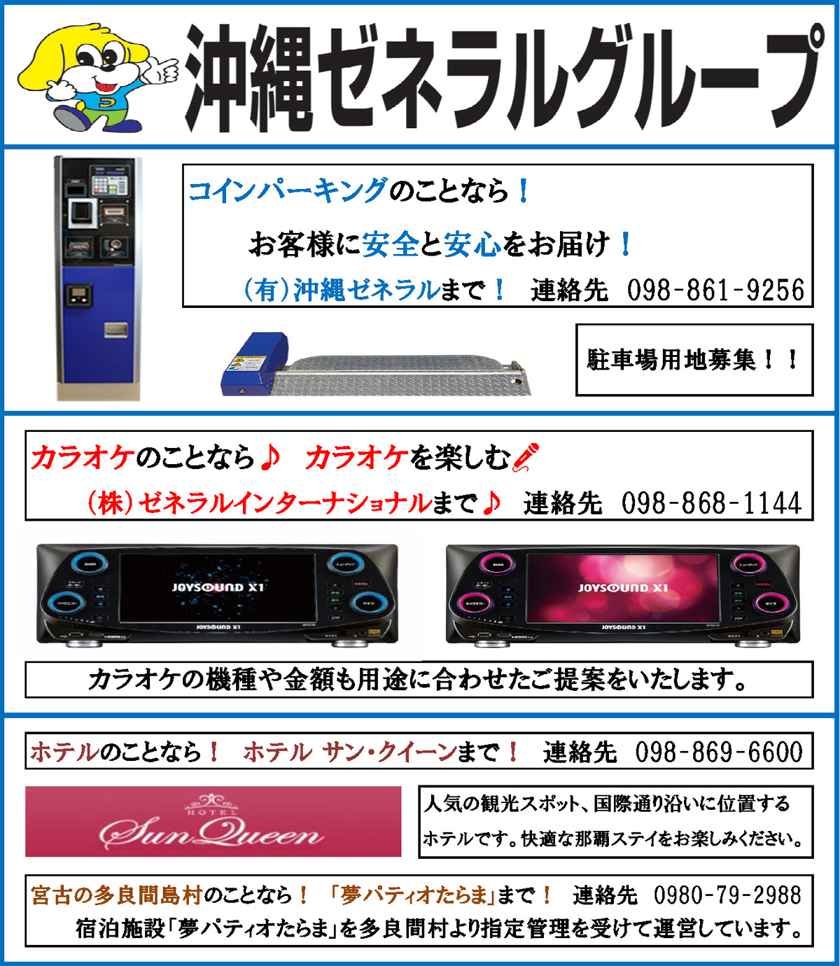 (有)沖縄ゼネラル、(株)ゼネラルインターナショナル、(株)ゼネラル情報通信など12社で構成する沖縄ゼネラルグループ。中核企業の(有)沖縄ゼネラルは、コインパーキングをメイン事業としている。(株)ゼネラルインターナショナルではカラオケ事業としてジョイサウンド機器のレンタル・販売とコインパーキングをメインに展開。(株)ゼネラル情報通信はauの携帯ショップを県内7店舗展開している。