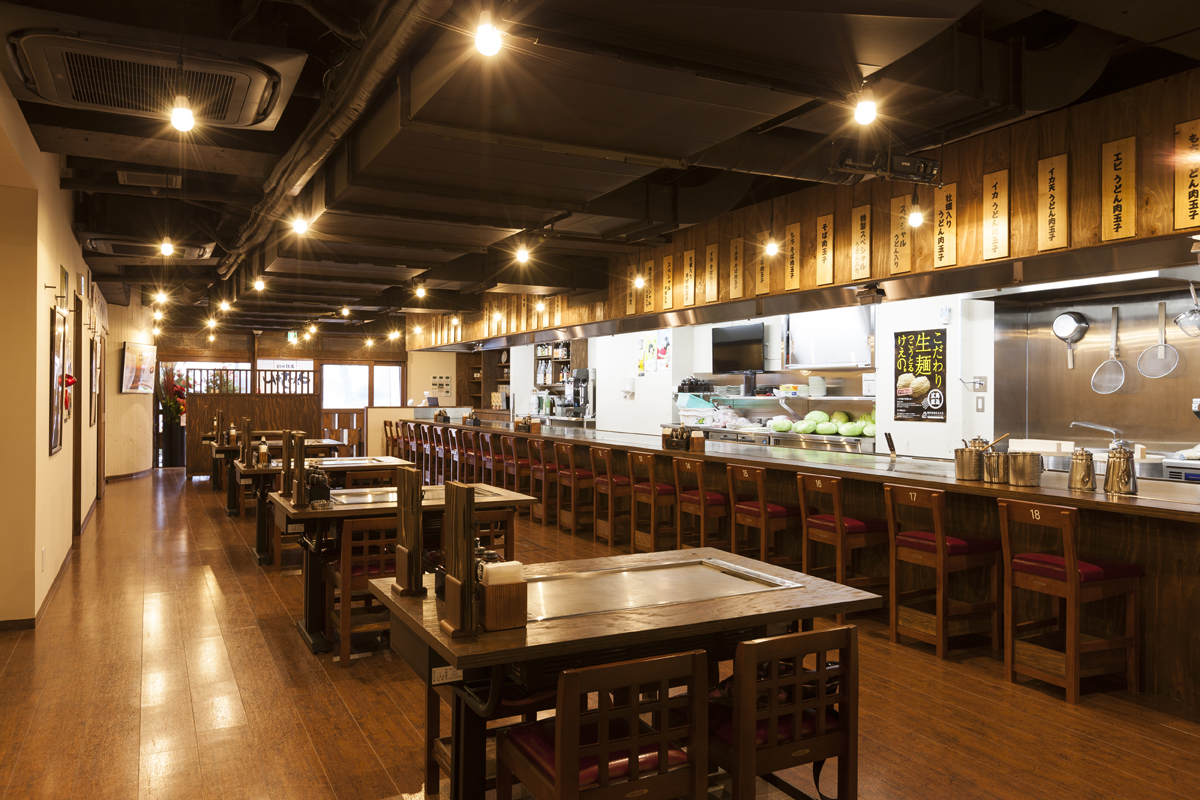 熟練の職人たちの連携とヘラさばきにより行われるお好み焼の調理は、圧巻のパフォーマンスです。 興味深く眺められるお客様や、写真を撮ってSNSに上げられるお客様も多いです。