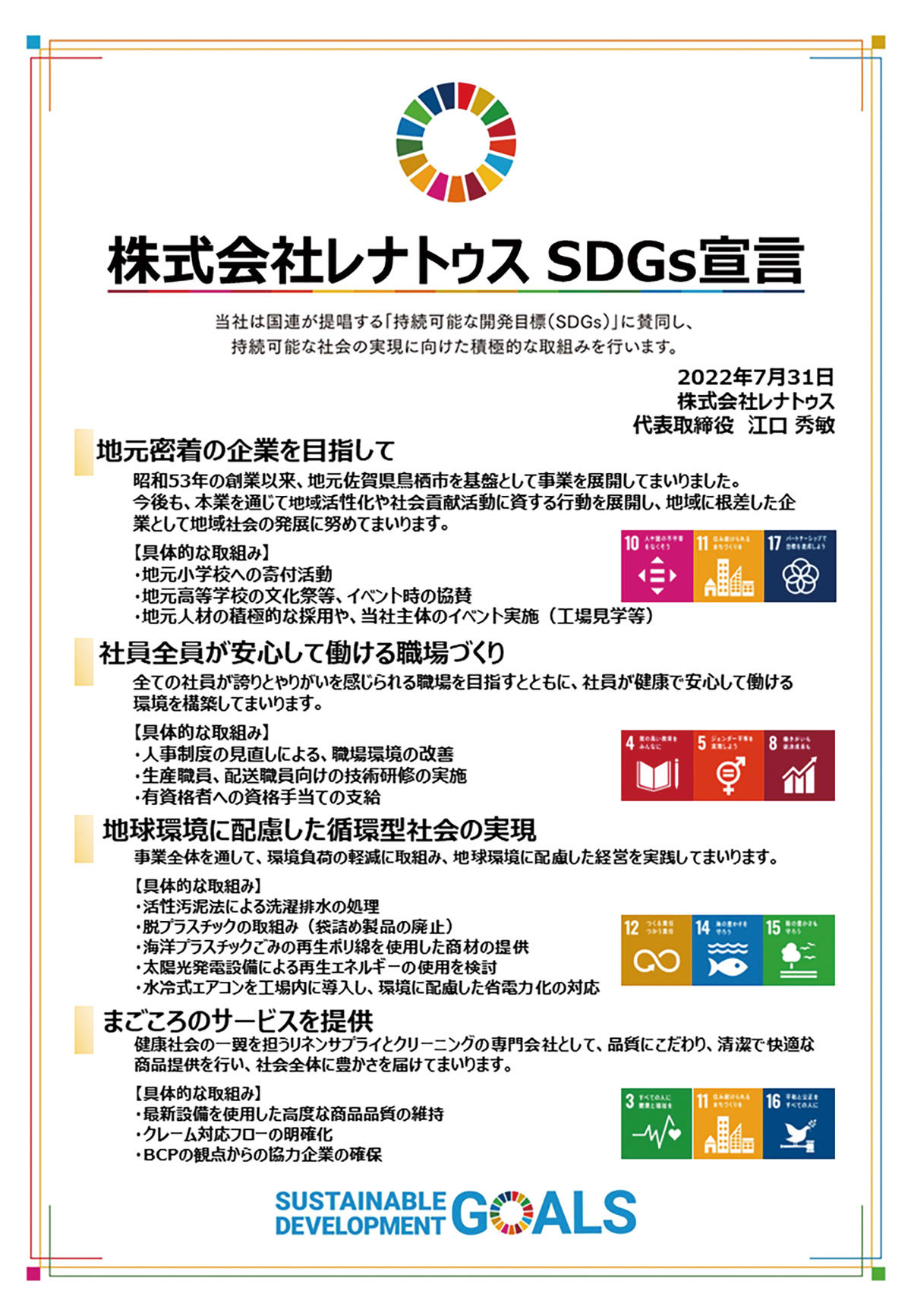本社外観(写真上)、SDGs宣言(写真左下)、大型洗濯機(写真中段右)、航空写真(写真右下)