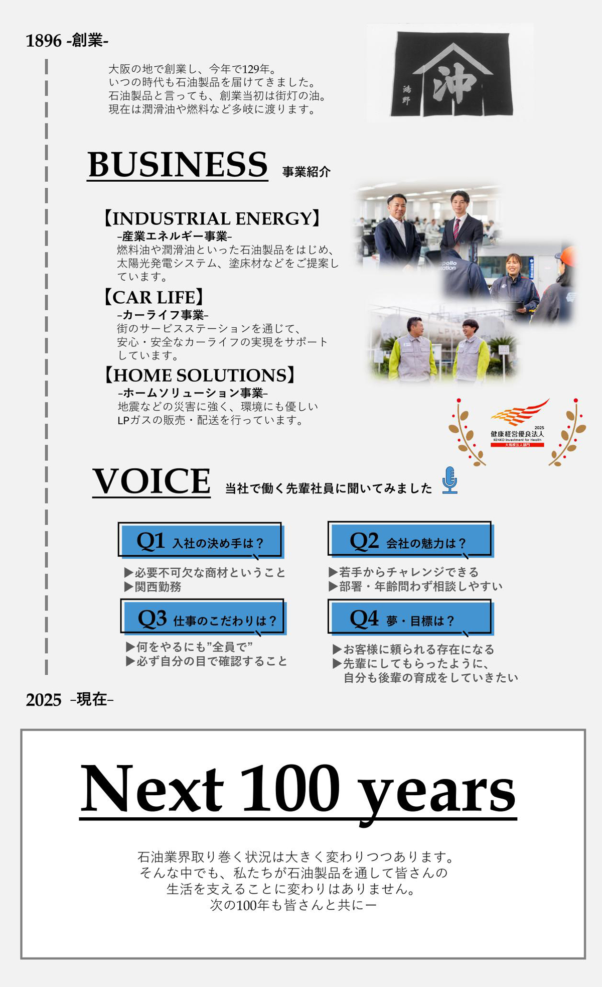 - 産業用の燃料油・潤滑油の販売、LPガスの販売、サービスステーションの運営、オートガスステーションの運営、中古車の販売、カーディテーリング事業、太陽光発電システムの販売、塗床材の販売