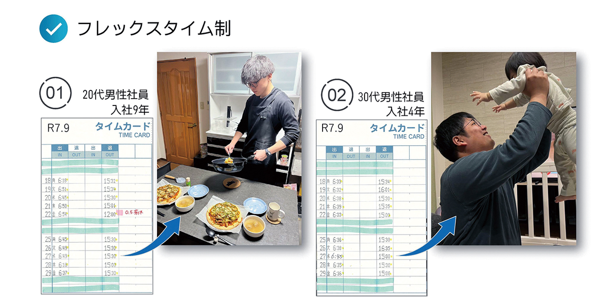 九州地方整備局長表彰社内祝い(写真中段右)、フレックスタイム制の活用事例(写真下段)