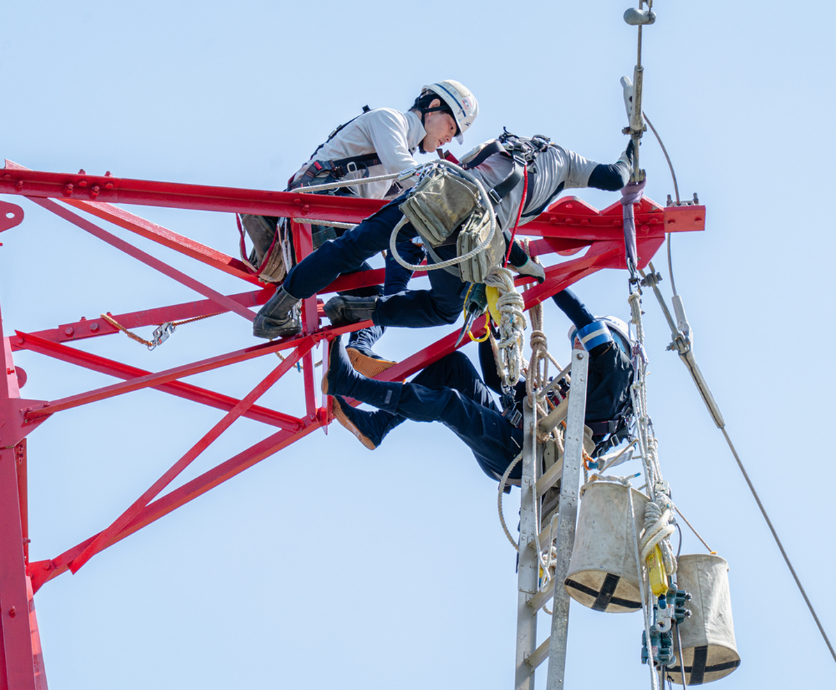 当社は送電設備工事、情報通信工事、一般電気工事、土木工事、塗装工事、測量・伐採など実は幅広く事業を手がけています。そのためさまざまな分野でキャリアアップを目指すことが可能です。鉄塔に登るのは体力的に不安な方、未経験の方でも心配いりません。